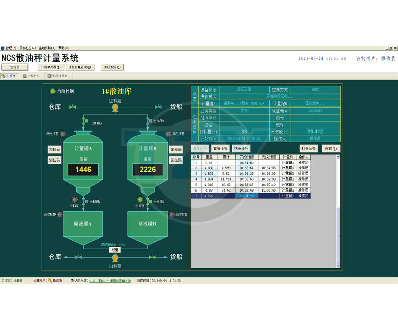 为了有效地解决液体物料的计量问题,可采用液体电子散料计量控制系统,它具有连续输送、静态计量、高精度等特点。该系统能很好地满足液体物料的接收、转运、发送等多种称重功能要求,广泛应用于港口、粮油、仓储等行业。